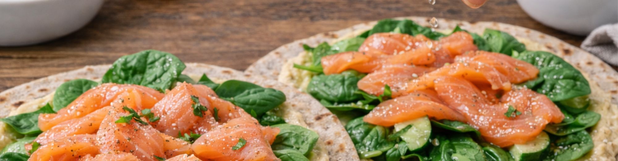 - Spalmare l’hummus ottenuto sulla piadina, aggiungere salmone affumicato o tofu grigliato, spinaci freschi e qualche goccia di limone.